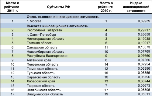 Инновацияләр һәм мәгълүмати технологияләр үсеше милли ассоциациясе төбәкләрнең инновацион активлыгы буенча 2011 ел өчен рейтинг әзерләгән.